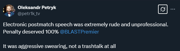 Petr1k在社媒上说:electroNic的赛后发言极其粗鲁且不专业,BLAST完全应当对其作出处罚。这属于充满攻击性的辱骂,根本算不上普通的*话。