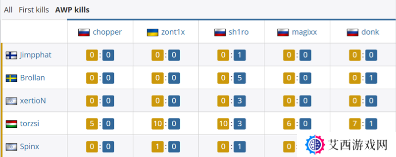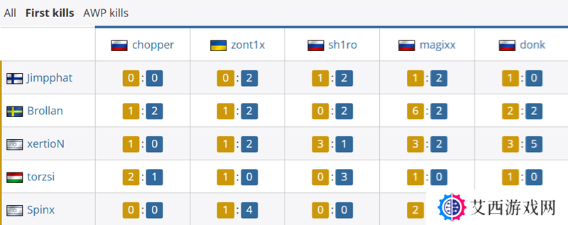 首杀对位上,作为MOUZ指挥的Brollan拿到10个首杀对位胜利,而chopper这一数据为3个。除了Brollan之外,xertioN也为对位贡献了11个首杀对位。Spirit一方donk贡献11个首杀对位,zont1x贡献10个首杀对位。