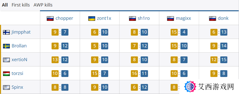 在全部对位数据上,donk除了面对torzsi和Spinx打得有来有回之外,对阵Jimpphat、Brollan都保持着大差值对位优势。而除了他之外,剩下Spirit队员中只有zont1x数据尚可,而magixx面对Jimpphat被打出4-15的对位数据,表现相当惨淡。