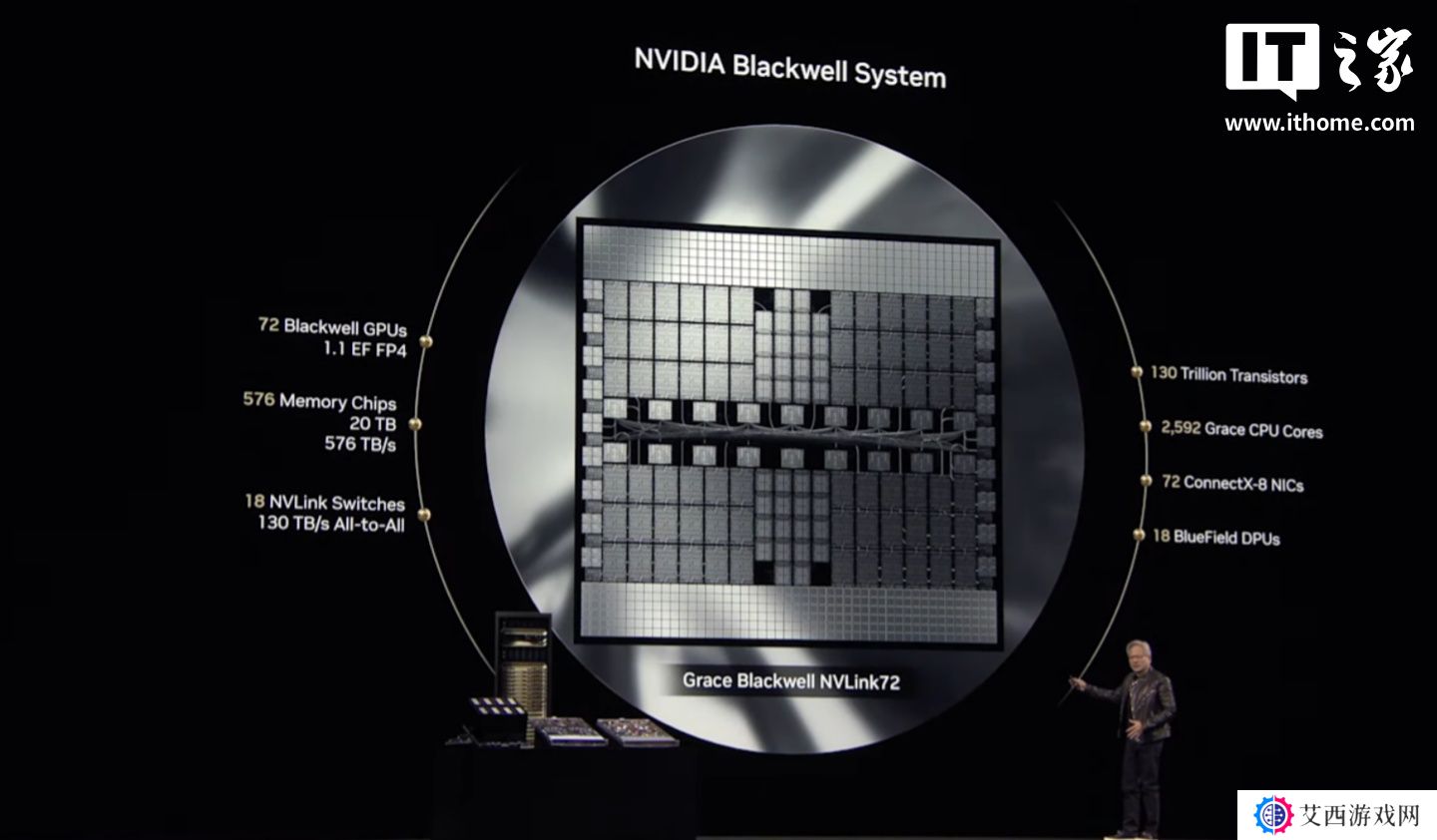 黄仁勋还展示了Grace Blackwell 系统,这个芯片已在年初的 CES 2025 亮相过,72 个 Blackwell GPU 集成在一个晶圆 Wafer 上。