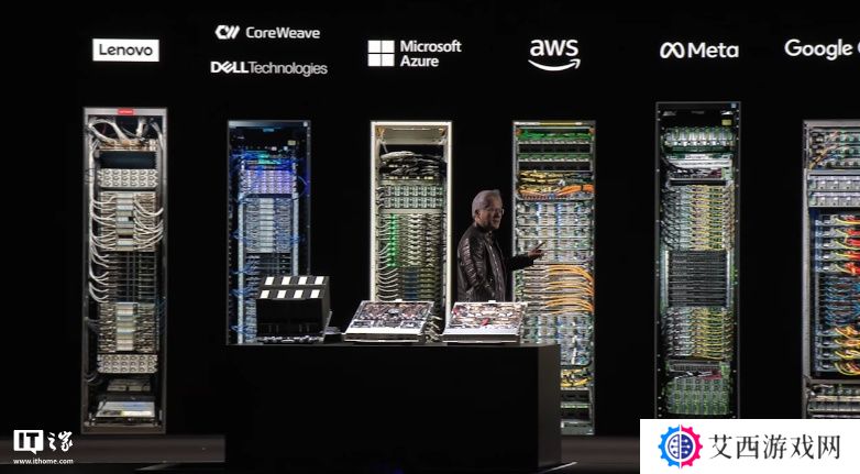 黄仁勋还展示了使用Grace Blackwell 的各厂商数据中心机架,可以看到包括联想、戴尔、微软、亚马逊 AWS、Meta、谷歌等。