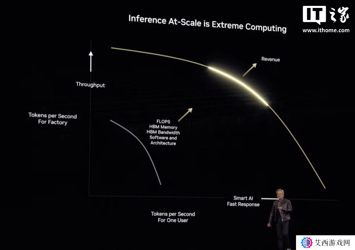 黄仁勋展示了一张关于推理的图表,X 轴显示用户每秒的 Token 数,Y 轴显示工厂每秒的 Token 数。这个问题涉及到大量的 FLOPS 和大量的带宽,这正是英伟达 Blackwell 系统所追求的。