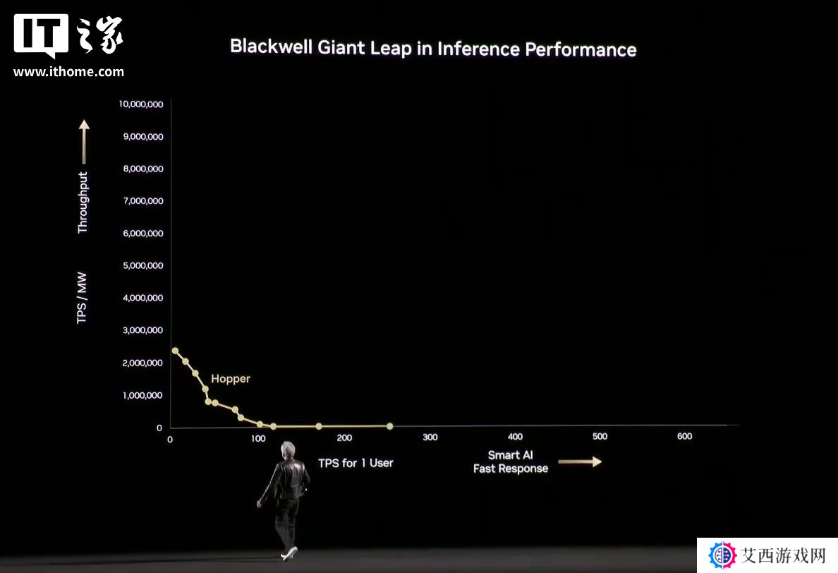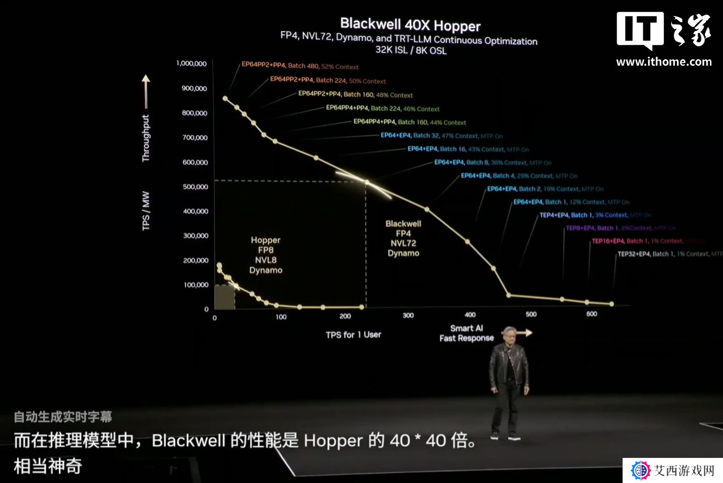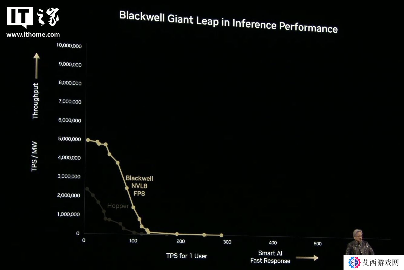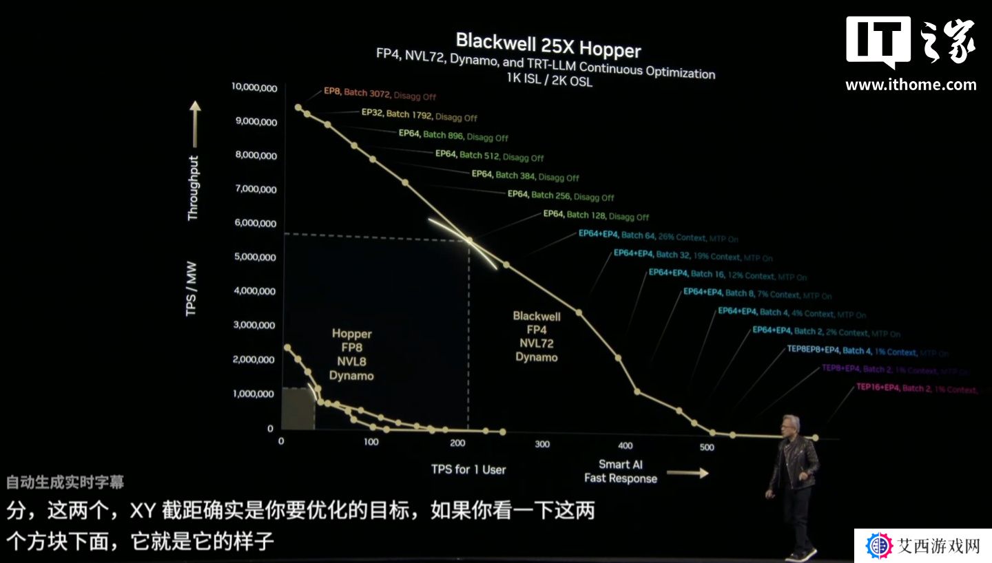 黄仁勋展示了一张关于推理的图表,X 轴显示用户每秒的 Token 数,Y 轴显示工厂每秒的 Token 数。
