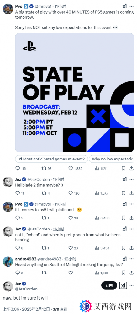 另外,在回复另一用户的问题时,Jez Corden还表示他可以确定另一款Xbox第一方游戏《午夜之难》最终也会登陆PlayStation,该作目前定于2025年4月发售。