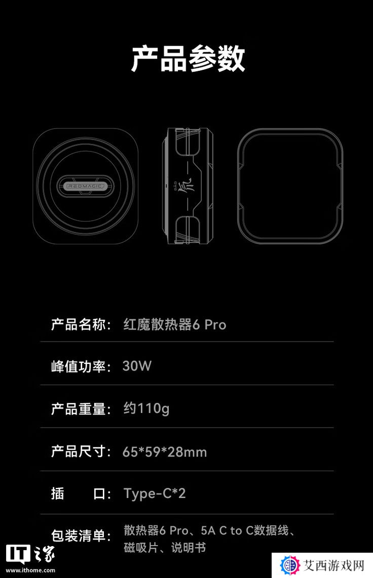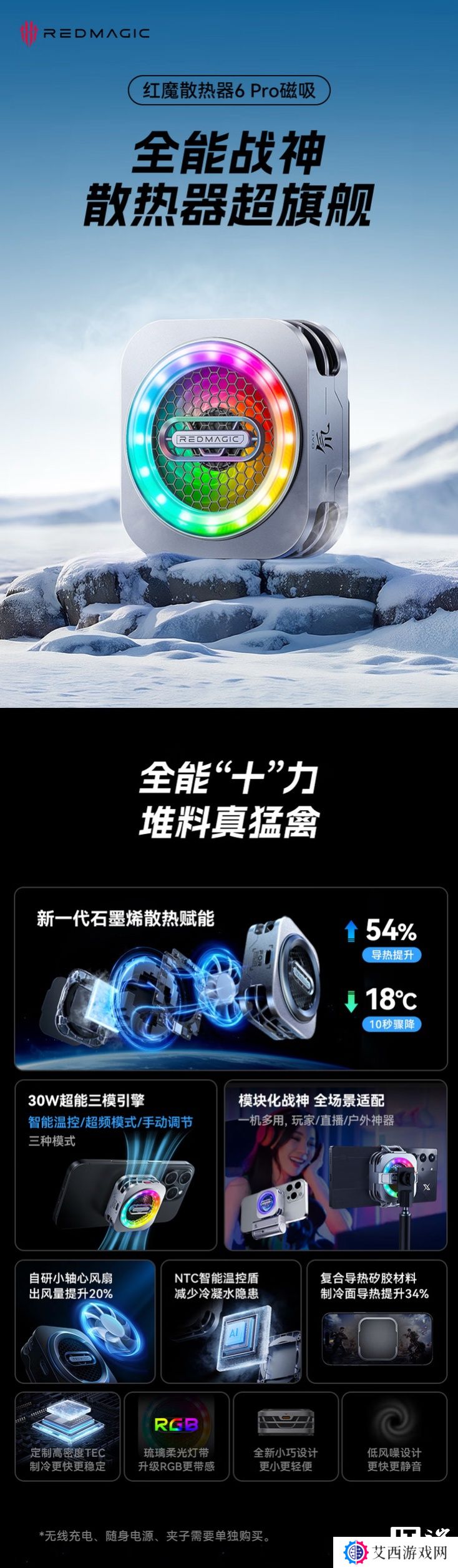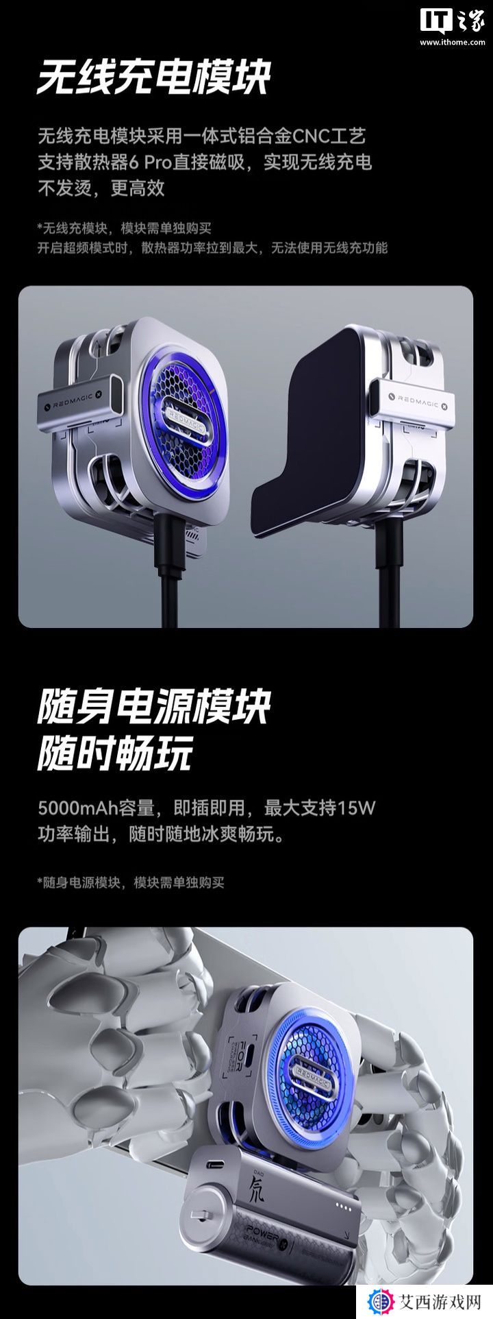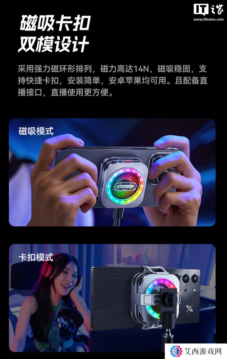 该散热器拥有 16 颗 RGB 灯珠,采用模块化设计,可以搭配 14N 磁力的磁吸模块吸附在具有磁吸功能的手机上,也可以搭配卡扣模块安装在没有相应磁吸功能的设备上,还能搭配无线充电 / 有线充电模块为设备充电,不过这些模块具体定价尚未公布。