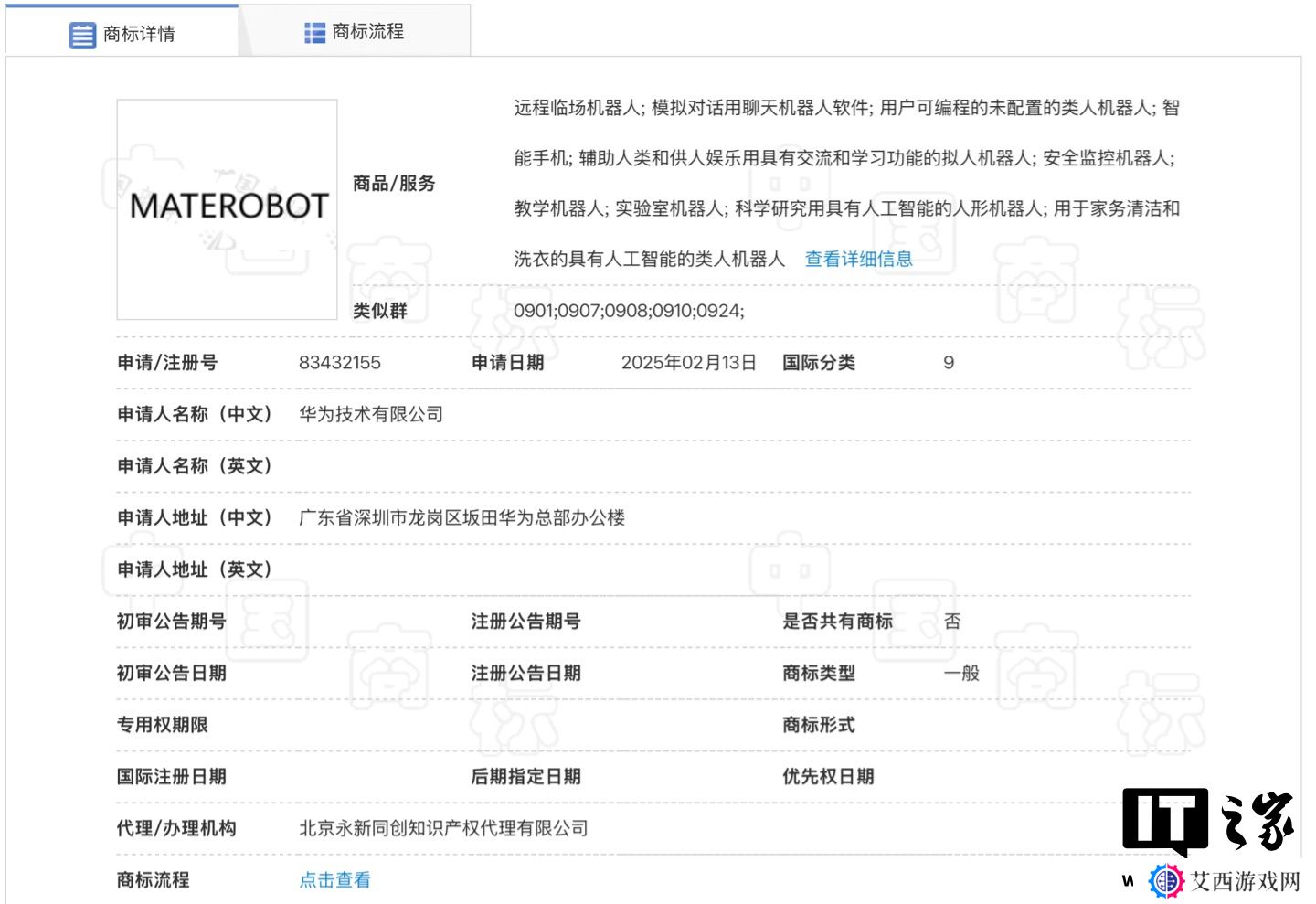 本站 3 月 16 日消息,国家知识产权局商标局(中国商标网)显示,华为技术有限公司在2月13日申请注册“MATEROBOT”商标,相应商标注册号为 83432155,国际分类为9(科学仪器)。