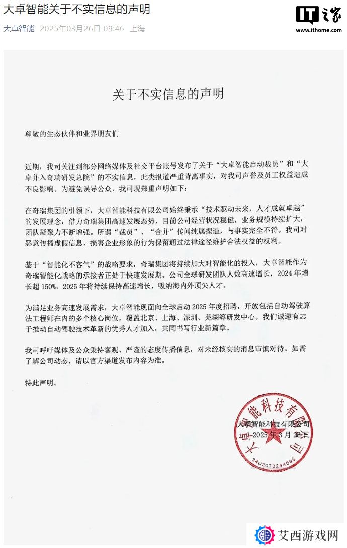 本站 3 月 26 日消息,今日奇瑞集团旗下大卓智能发布声明称,公司关注到部分网络媒体及社交平台账号发布了关于“大卓智能启动裁员”和“大卓并入奇瑞研发总院”的不实信息,此类报道严重背离事实。