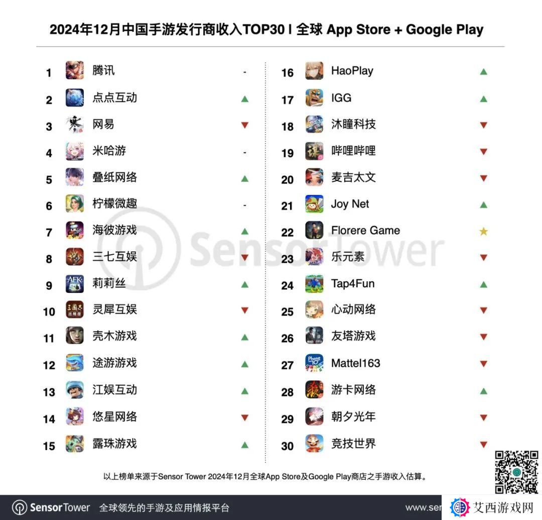 2024年12月中国手游发行商全球收入排行榜是一览