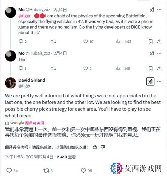 《战地》首席制作人David Sirland最近回复了一位粉丝的评论,这位粉丝强调说,《战地2042》的载具操控和物理效果很差,夺走了这个IP传统就有的真实感。