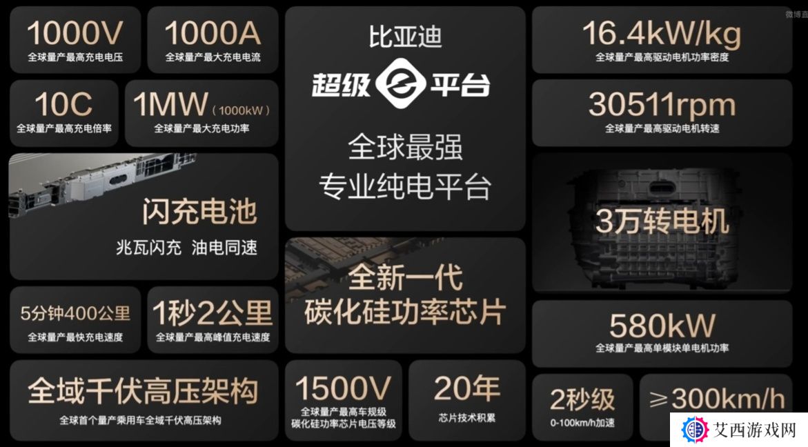 比亚迪还发布了“全球最强”专业纯电平台超级 e 平台,具备 3 万转电机、全域 1000V 高压架构、单电机功率 580kW、超过 300km/h 的最高车速。本站附该平台主要特性介绍图如下: