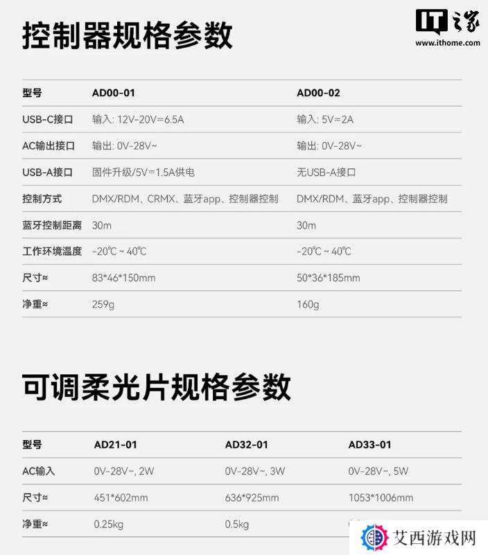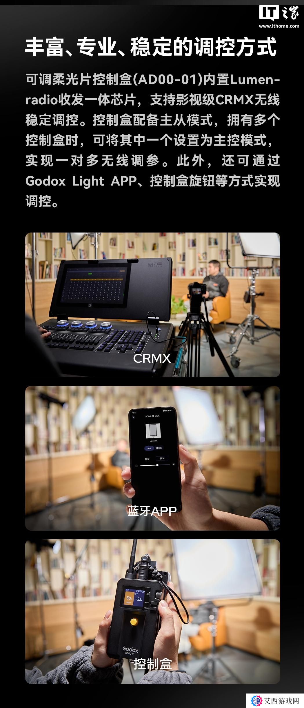 在调控方式方面,该系列可调柔光片的控制盒(AD00-01)内置 Lumen- radio 收发一体芯片,支持影视级 CRMX 无线稳定调控,此外还支持手机 App、控制盒旋钮等方式调控。