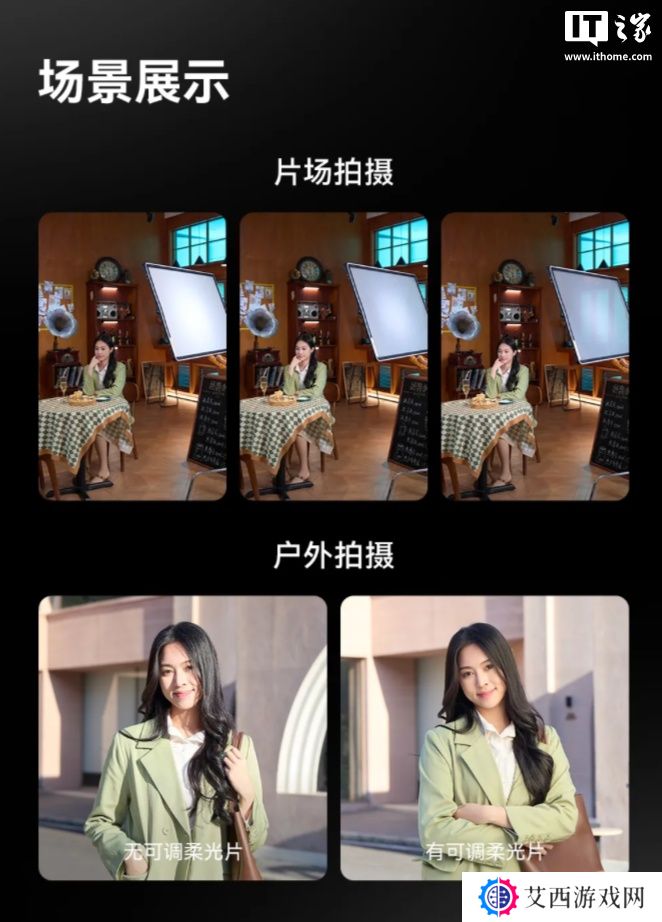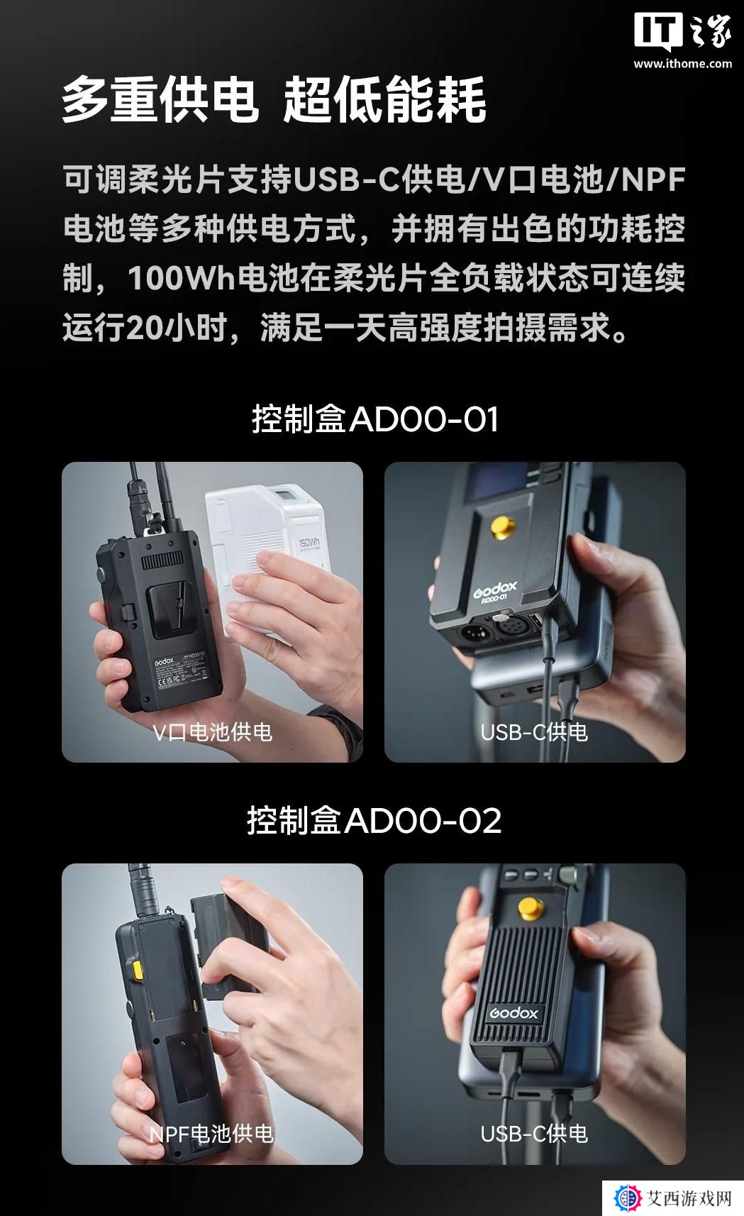 在供电方面,该系列可调柔光片拥有 USB-C 供电、V 口电池和 NPF 电池等多种供电方式,根据官方介绍,使用 100Wh 的电池在柔光片全负载状态下可连续运行 20 小时,可满足一天的高强度拍摄需求。