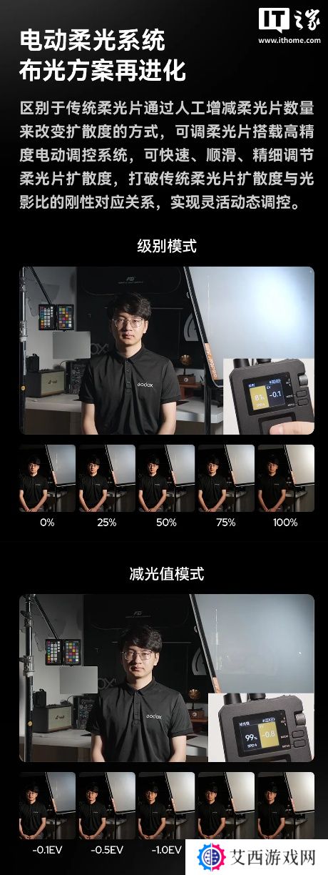 根据神牛官方介绍,该系列可调柔光片区别于传统柔光片通过人工增减柔光片数量来改变光扩散度的方式,搭载电动调控系统,可一键调节柔光片扩散度,拥有级别模式和减光值两种调控模式,级别模式可在 0~100% 的百分比值之间可视化快速调节,减光值模式支持-0.1~-2.0EV 的调控,更贴合专业用户的习惯,实现灵活动态调控。