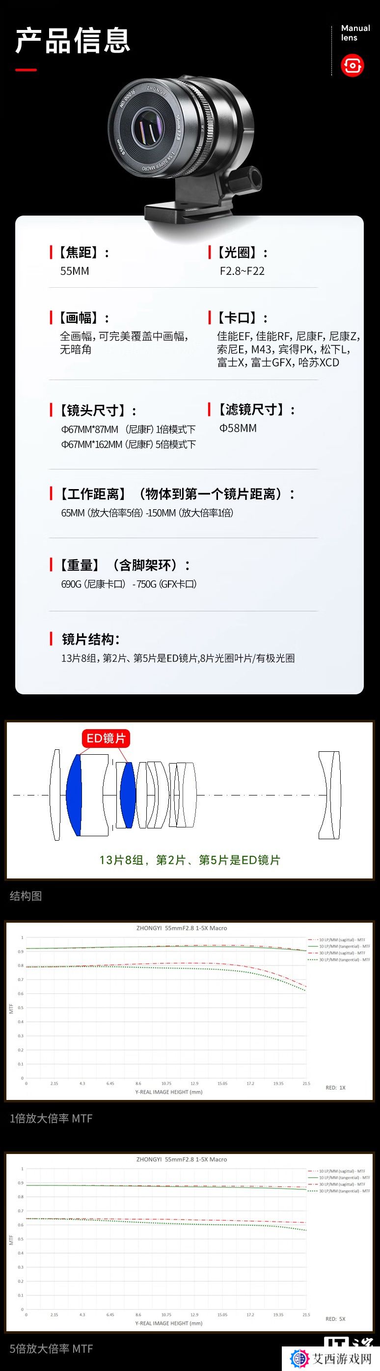 该镜头使用13片 8 组结构,重量根据不同卡口有所差异,在690g (F 卡口)- 750g (GFX 卡口) 不等,滤镜尺寸为 58mm。