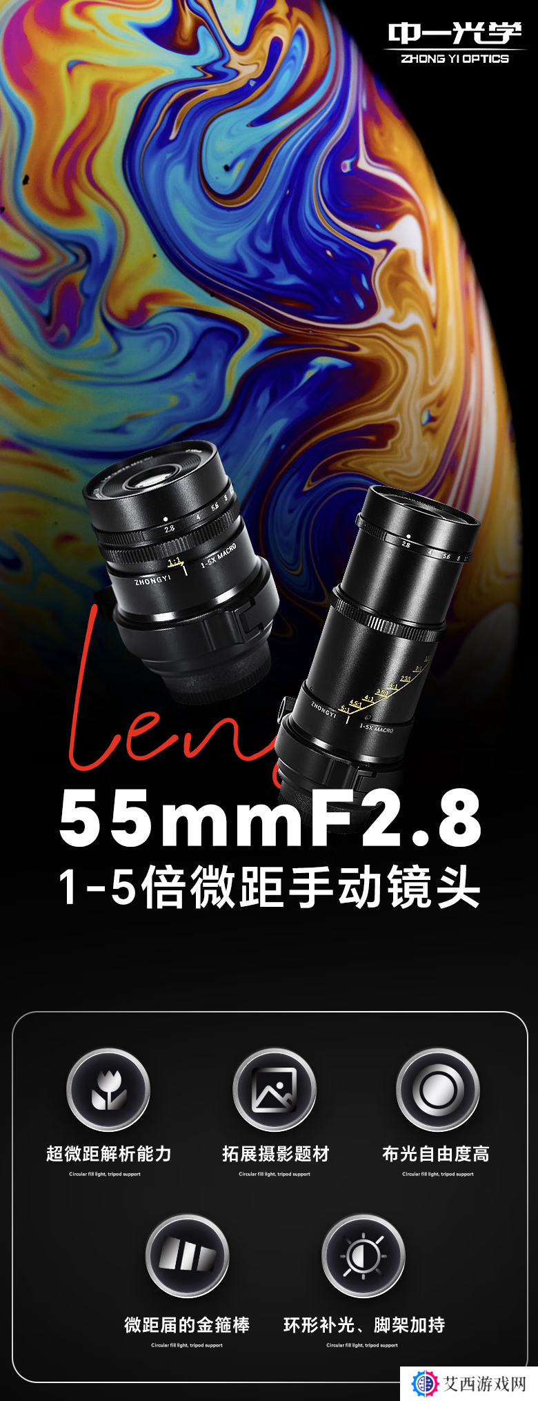 本站3 月 28 日消息,中一光学旗下 55mm F2.8微距镜头现已在京东开售,主打“1-5 倍微距”,标准价 2880 元,首发价 2630 元。