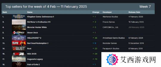 日前,Steam平台公布了2025年第7周的周销榜排名。本期榜单涌现了许多新作,其中《天国:拯救2》首次蝉联了周销榜冠军。另有《文明7》以及《怪物猎人 荒野》这两款预购游戏,攀上了榜单的前三名。