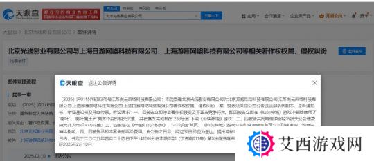 天眼查App显示,浦东新区人民法院向江苏尚云网络科技有限公司公告送达北京光线影业有限公司诉北京龙威互动科技有限公司、江苏尚云网络科技有限公司、上海游雁网络科技有限公司、上海日游网络科技有限公司著作权权属、侵权纠纷案件起诉状副本、开庭传票等。