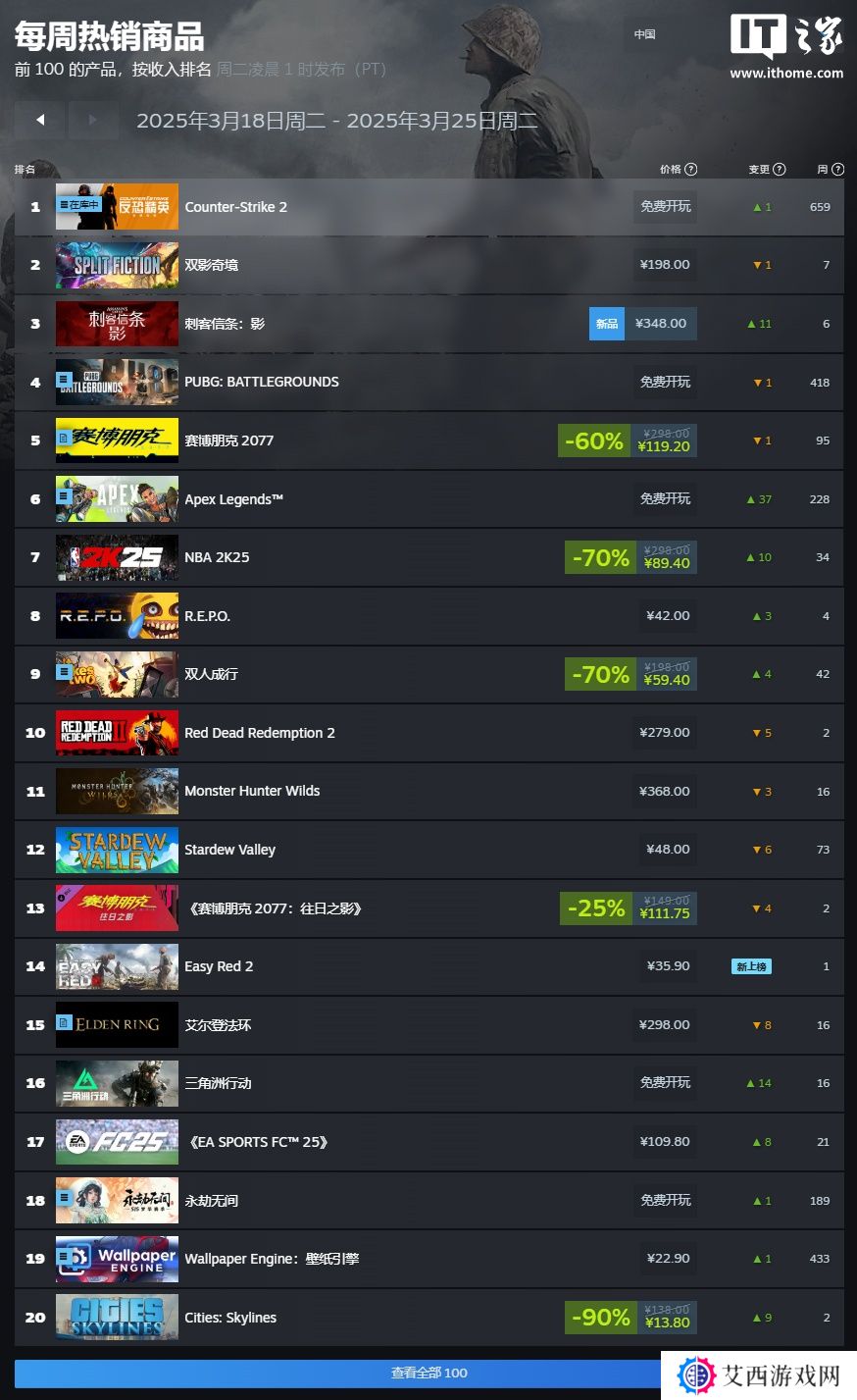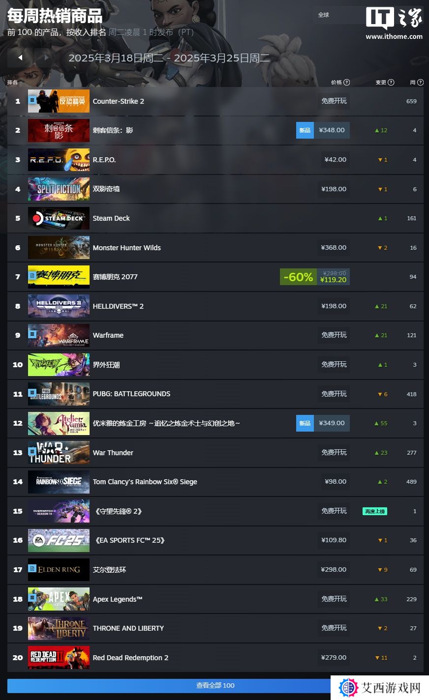 本站 3 月 26 日消息,Valve 昨晚公布了 Steam 最新一周游戏销量排行榜,《刺客信条:影》全球登顶,在线合作恐怖游戏《R.E.P.O.》滑落至第二名,《双影奇境》第三。