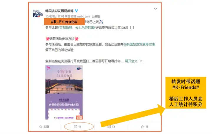 K-friends是韩国旅游发展局运营的官方线上应援团,k-friends意为“喜爱韩国的朋友们”,通过在线分享和传播韩国的文化、美食、时尚、潮流、k-pop等种类多样的内容,获得积分领取相应的奖励,担当着向全世界介绍韩国的宣传大使的重要角色。