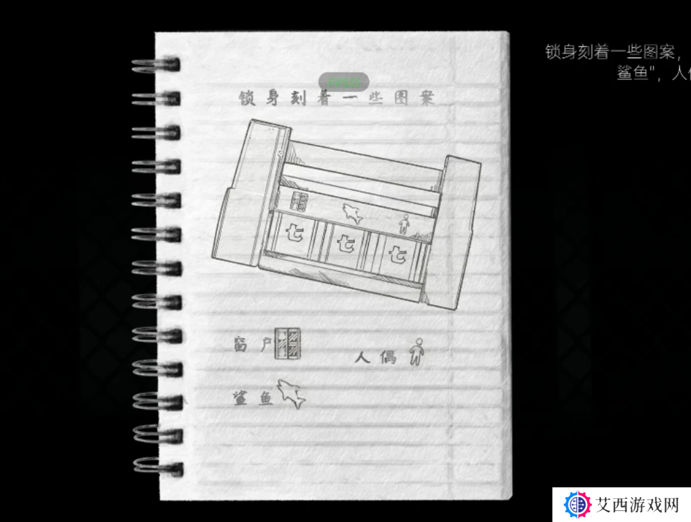 进入后门旁边就有个干尸,查看一下拿到女纸人,继续向左走有个折叠梯需要密码,密码提示如果看不清楚图案可以看右上角的笔记本,笔记上清楚的提示窗户、鲨鱼、人偶,我们已经知道窗户是十,人偶应该就是雕像上的六了,鲨鱼在最左边过去看看。