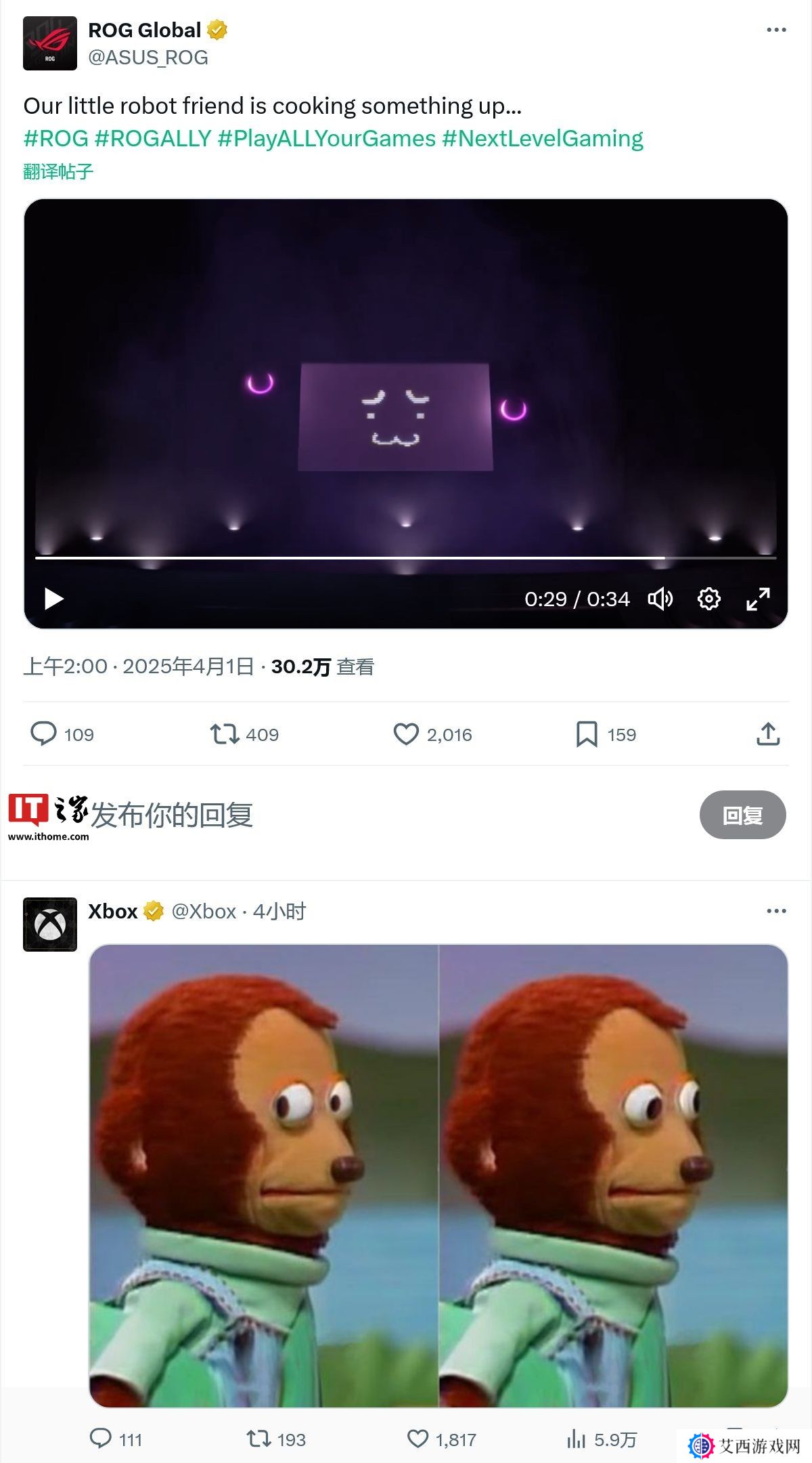 本站 4 月 1 日消息,华硕 ROG 玩家国度官方账户今日在 X 平台预热新款 ROG Ally 系列掌机设备,值得注意的是微软 Xbox 官方也在该动态下方进行了玩梗式回应,预计新设备即此前传闻中的双方合作款 Project Kennan。