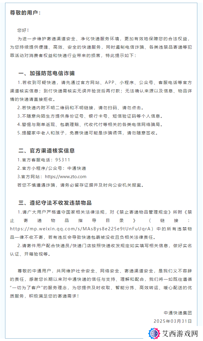 本站 3 月 31 日消息,中通快递今晚发布《告客户书》,提醒加强防范电信诈骗:“为进一步维护寄递渠道安全、净化快递服务环境,更加有效地保障您的合法权益,为您持续提供便捷、高效、安全的快递服务,同时遏制电信诈骗、各类违禁品寄递等犯罪活动对消费者权益和快递行业带来的损害。”