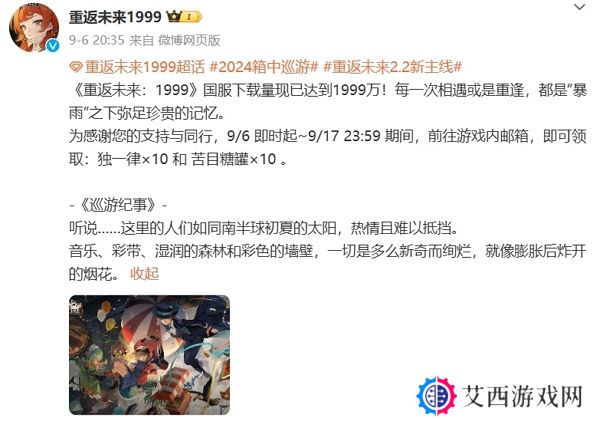 重返未来1999下载量突破1999万 登录领庆贺奖励。重返未来1999的国服下载量在不久前突破了1999万,为了庆祝这个非凡的数字,玩家登录即可领取庆贺福利。