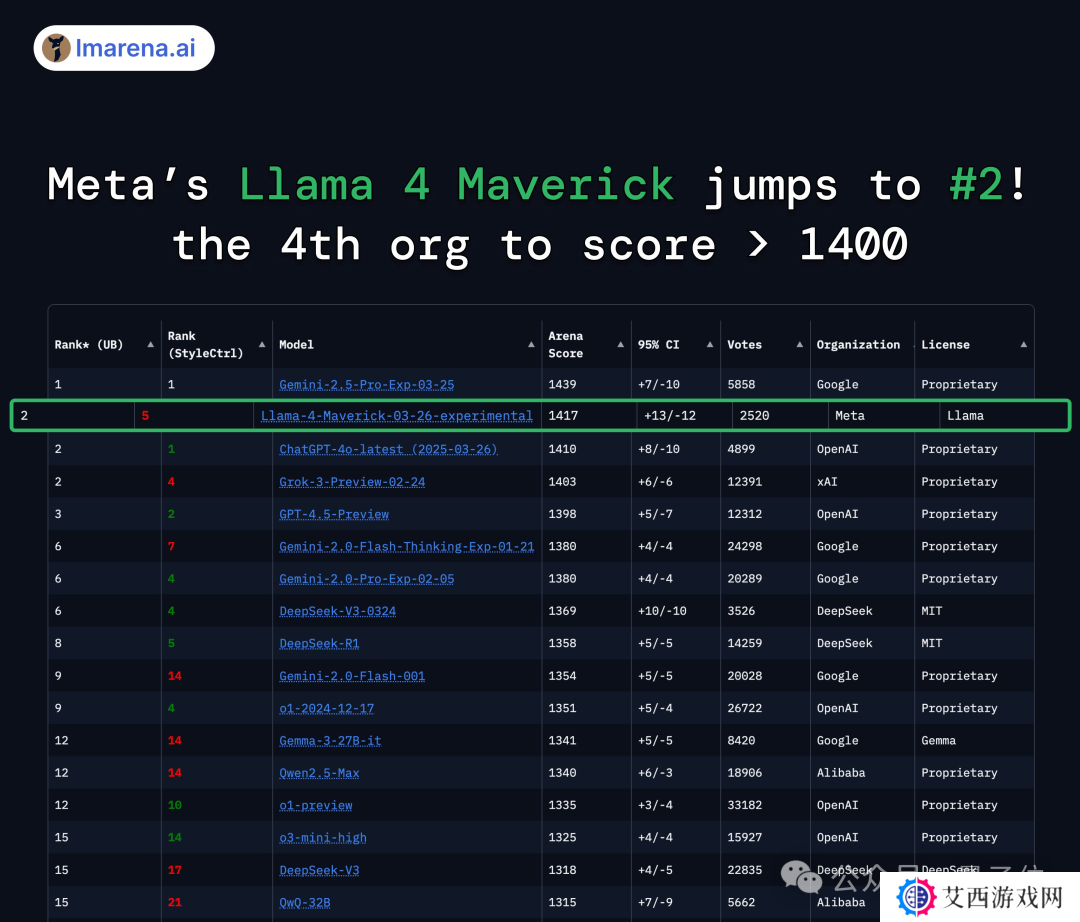 此次发布的 Llama 4 Maverick,在困难提示、编码、数学、创意写作方面并列第一;得分 1417,不仅大大超越了此前 Meta 自家的 Llama-3-405B(提升了 149 分),还成为史上第 4 个突破 1400 分的模型;。