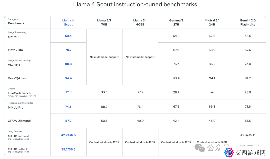 这一点主要体现在 Meta 公布的中杯 Llama 4 Scout 的详细数据里: