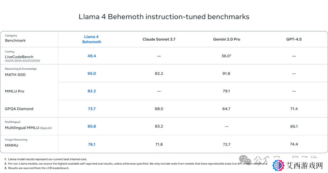 Llama 4 Behemoth:2 万亿参数的超大超强模型,以上二者都由这个模型蒸馏而来;目前还在训练中;多个基准测试超过 GPT-4.5、Claude Sonnet 3.7 和 Gemini 2.0 Pro。