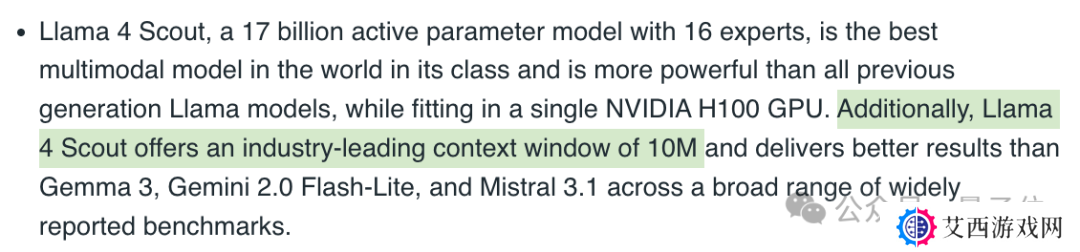 Llama 4 Scout,16 位专家的 170 亿激活参数的多模态模型,单个 H100 GPU 可运行,同类 SOTA,并拥有 10M 上下文窗口。