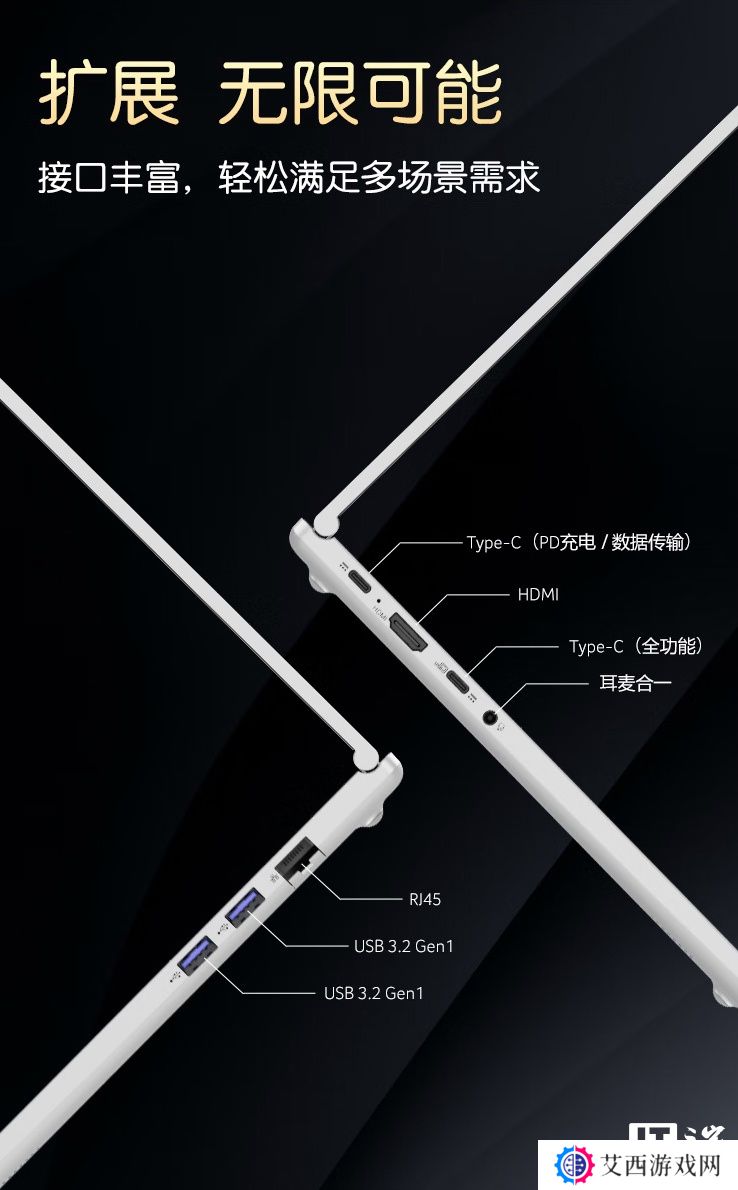该机支持Wi-Fi 6E技术,I/O方面左侧配备 1 个 USB-C接口、1个 HDMI接口、1个“全功能”USB-C接口、1个 3.5mm音频接口;右侧配备2个 USB-A 3.2 Gen 1接口、1个 RJ45 网口。