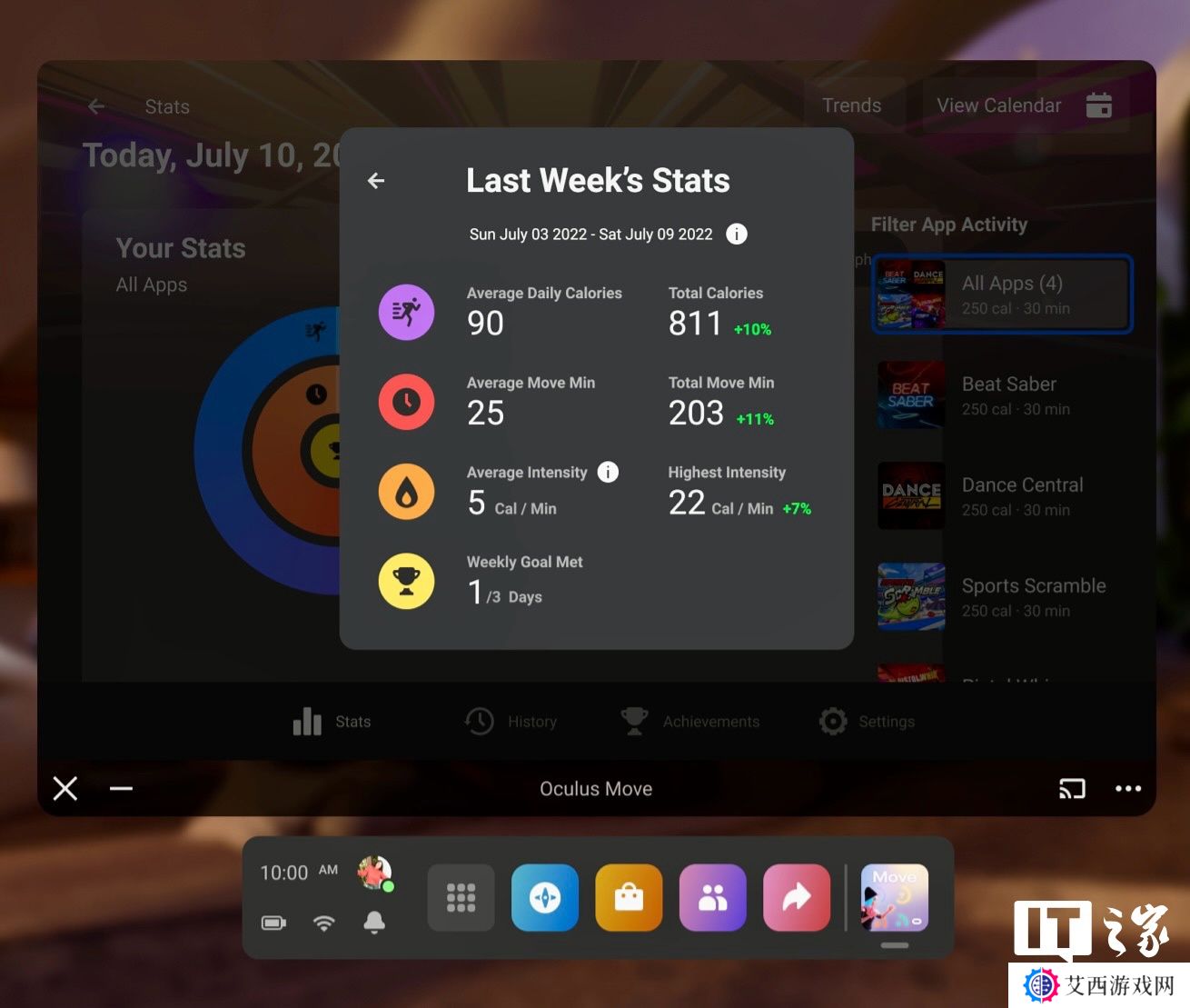 本站注意到,这款App的主要作用就是展示用户使用VR头显时燃烧的卡路里等内容,用户可以自行在App中设置每天、每周运动目标。此外用户在运行其他游戏应用时,也可以呼出 Quest Move 应用托盘(叠加层)查看健康数据。
